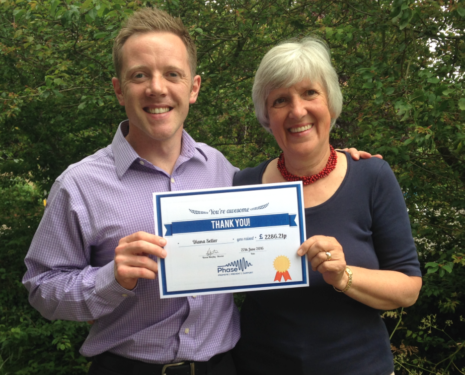 Back in May Diana Seller took on a personal challenge in memory of her son Mark and raised a whooping £2286 for the work of Phase! Diana's original hope was to hopefully reach £1000, but has been blown away by peoples support. This money will enable Phase to deliver four support courses for young people struggling with difficulties such as self-harm.