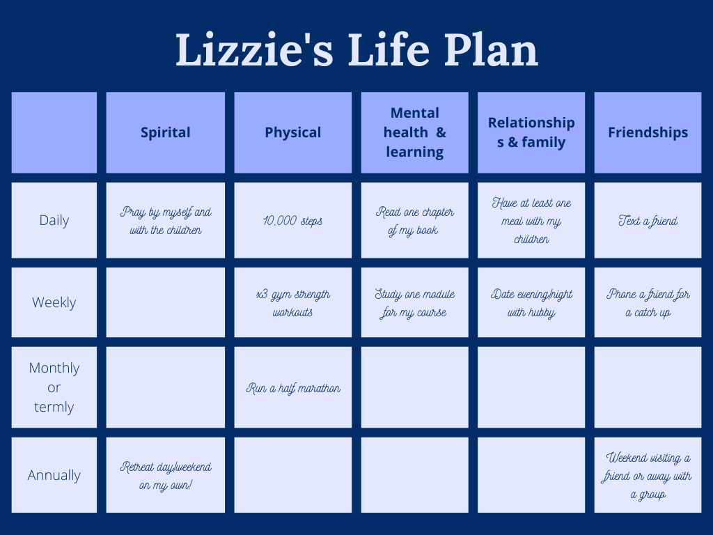 We looked at a few key aspects that we can use to decide on our life rhythm and broke it down into a daily, weekly, monthly and annual pattern. Then we thought about the areas of our life (these might be different for everyone, depending who you live with, your job, caring responsibilities, etc). For me it was about my spiritual life, physical, mental and learning, relationships and family, and friendships.